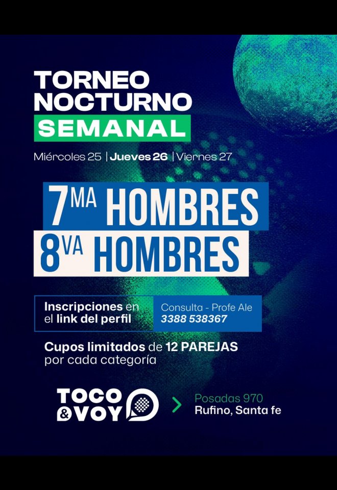 »» Evento: TORNEO NOCTURNO MIERCOLES 25- JUEVES 26- VIERNES 27 »» Localidad: Rufino »» Fechas: 25/03/2026 al 27/03/2026