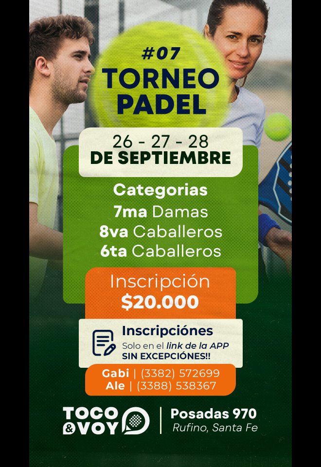 »» Evento: TORNEO 26-27-28 7MA DAMAS 8VA-6TA CABALLEROS »» Localidad: Rufino »» Fechas: 26/09/2025 al 28/09/2025